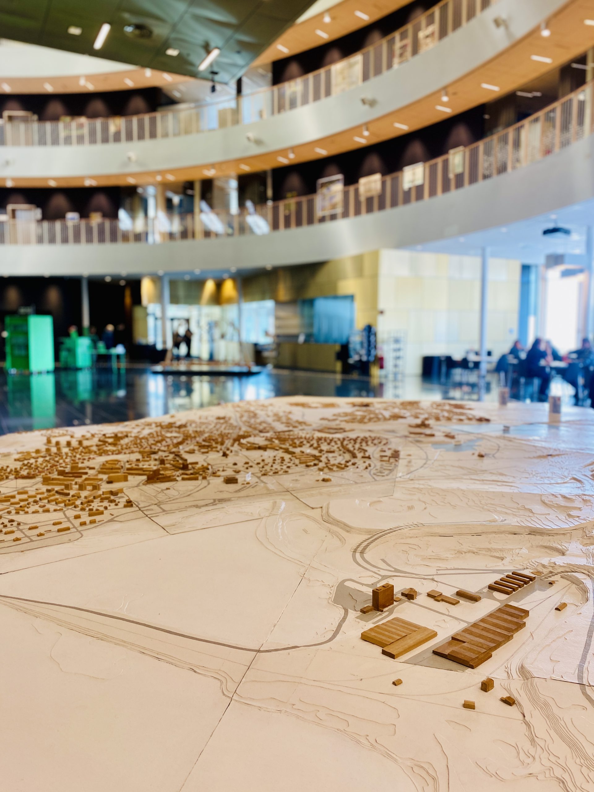 Eenzelfde functie heeft het stadhuis. De laagdrempelige toegang valt op. Ik ben er op een dag dat ambtenaren vrij zijn, maar kan over alle verdiepingen van het gebouw dwalen. De cirkelvormige plattegrond kent een binnenring, uitkijkend over het centrale atrium en een buitenring. De binnenringen zijn ingericht als museum voor moderne kunst en toegankelijk voor publiek. De buitenringen ontsluiten de ambtelijke en bestuurlijke ruimtes en functies. Waar je als publiek niet kunt komen, maar wel een blik op de bureaus kunt werpen. Het café nabij de entree serveert koffie en taart voor werkenden, maar ook buiten werktijden voor binnenlopende inwoners.