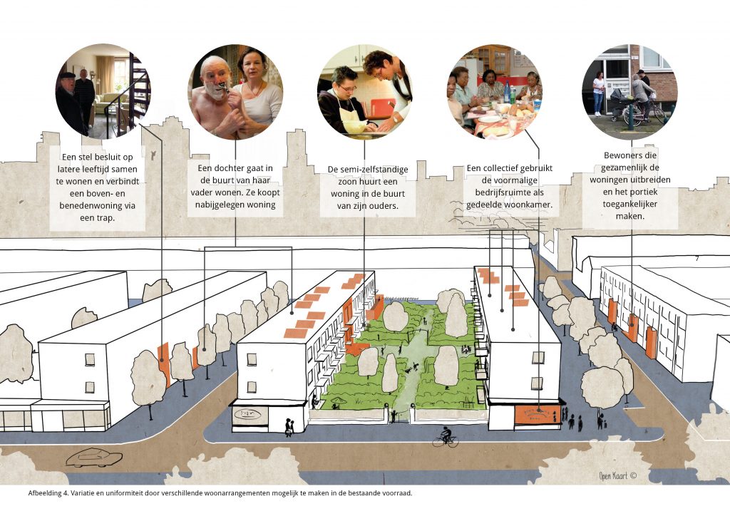 Kennelijk kunnen we als ontwerpers door het formuleren en visualiseren van mogelijkheden bijdragen aan het aantrekken van dergelijke initiatieven. En daarmee aan meer sociale samenhang en informele ontmoeting in een kwetsbare wijk. Wat daarbij opvalt, is dat de combinatie van woonwensen vooropstaat. Als de omgeving voldoende kneedbaar is, kunnen door samenvoegen, verbouwen en uitbreiden de ruimtelijke voorwaarden ontstaan waarmee het prettig wonen is.